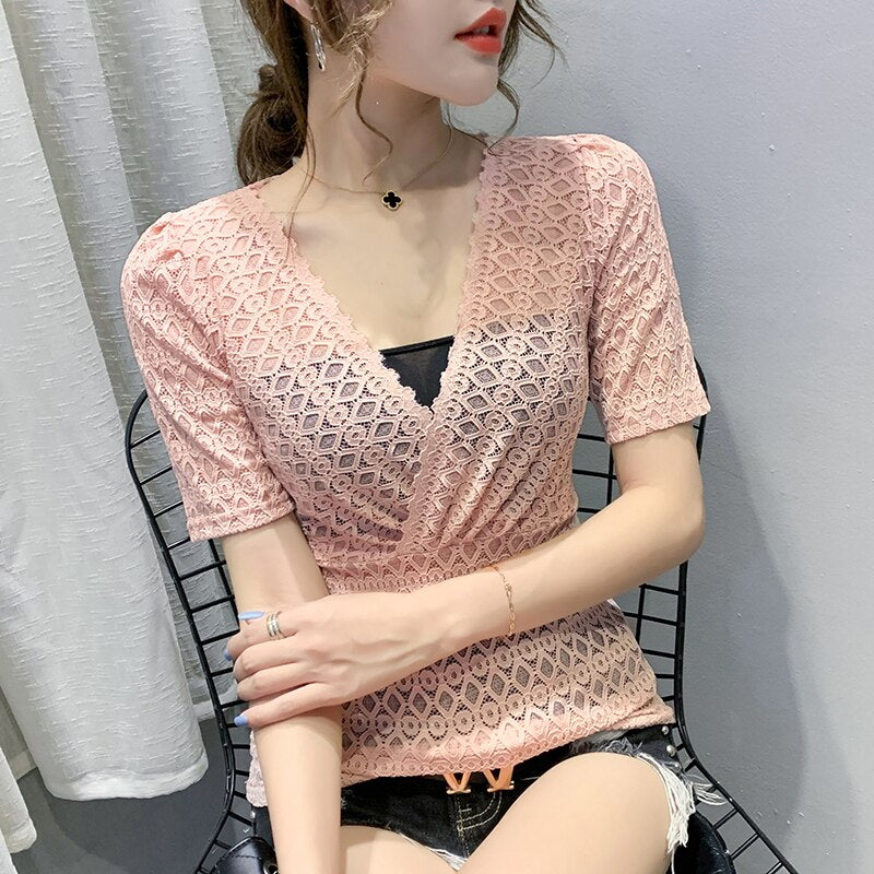 2021 Summer Short Sleeve V-Neck Lace Tops Fashion Casual Hollow Out Women's T-Shirt Elegant Slim Female Blusas