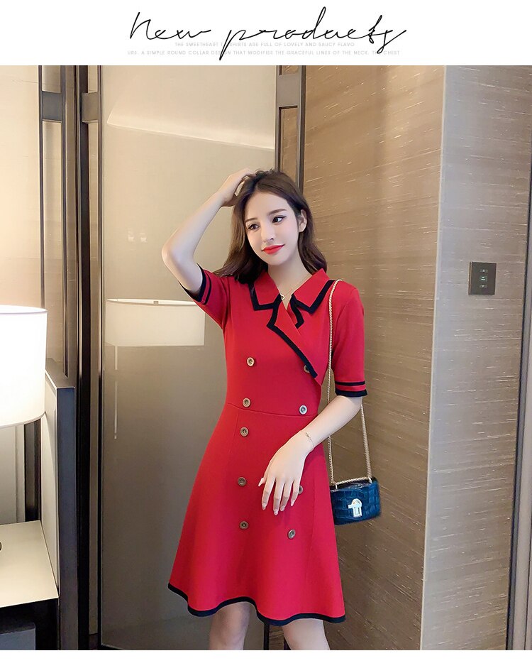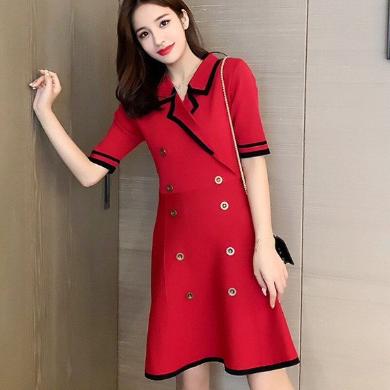 2021 Summer Women Short Sleeve Double-breasted A-Line Knitting Dress Office Ladies Casual Mini Dress