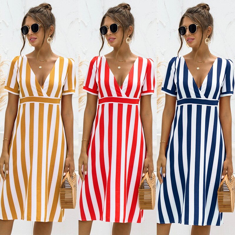 2021 Summer Women's Fashion Casual Stripe Deep V Neck Patchwork Short Sleeve Zippers A Line Knee Lenght Dress Ladies Basic Slim