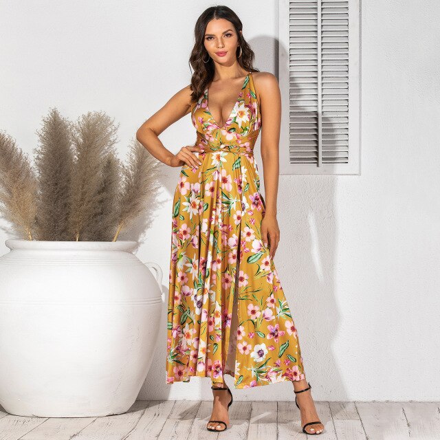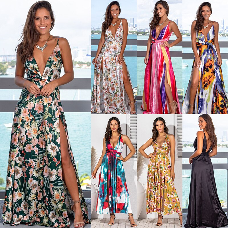 2021 Summer Women's Fashion Sexy Print Spaghetti Straps Deep V Neck Backless Sleeveless Zippers Split Foor Lenght Dress Ladies
