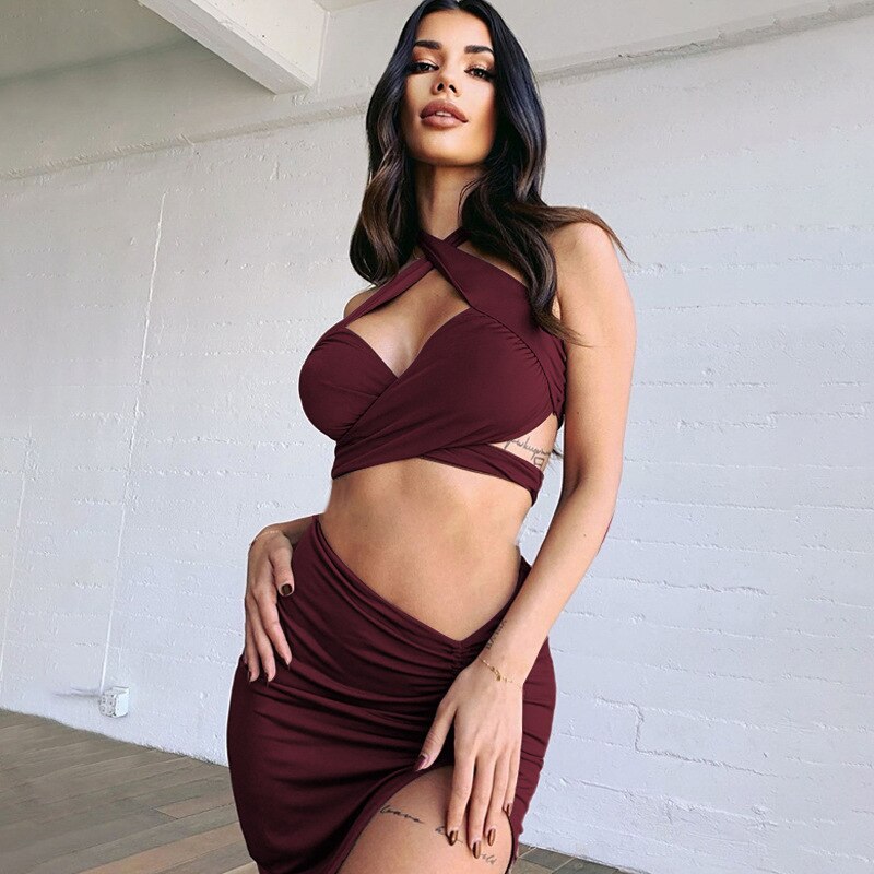 2021 Summer Women's New Style Bowknot Cross-Tie Cropped Top with Oblique Split Short Skirt Set