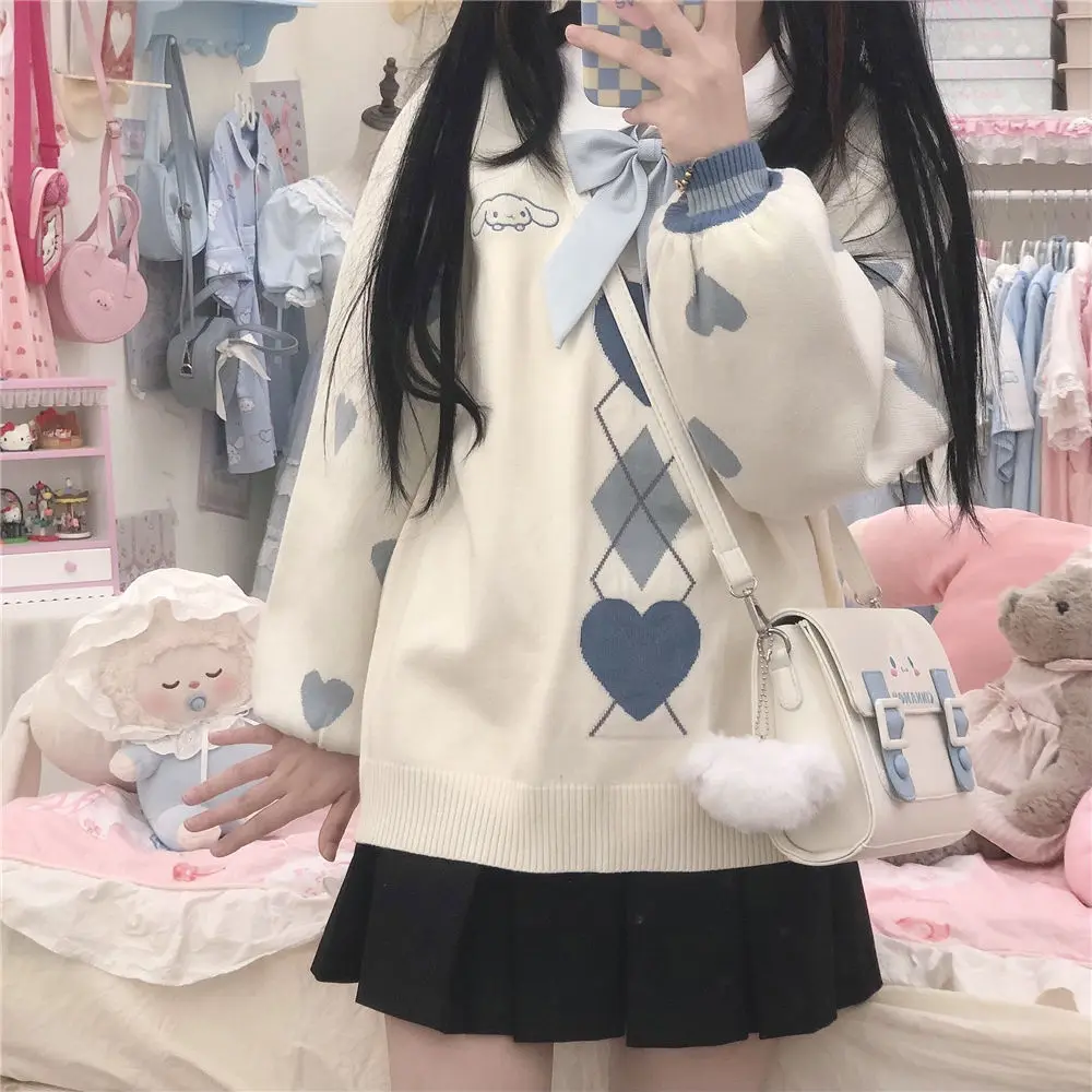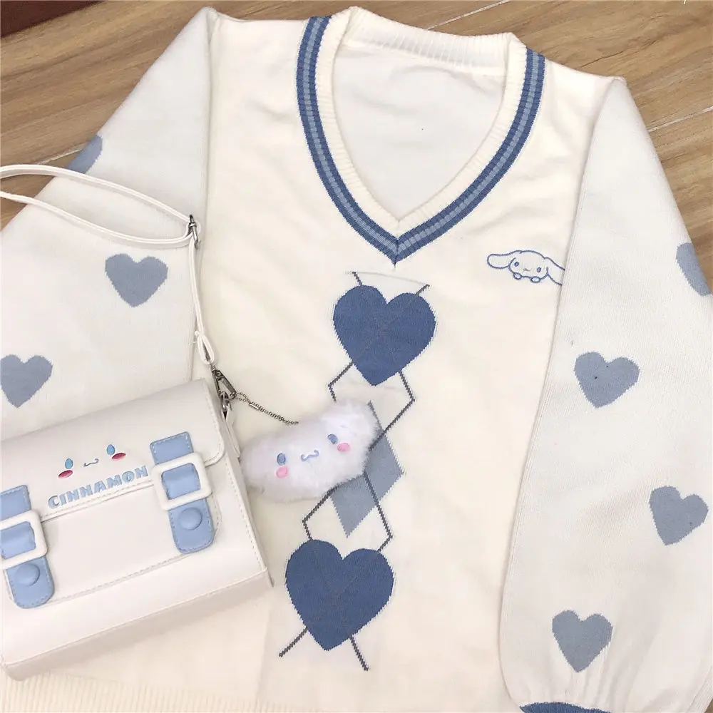 2022 New Fresh Print Heart Sweater Women V-neck Long Sleeve Cartoon Cute Jumper Japanese All Match Soft Kawaii Pullover Femme