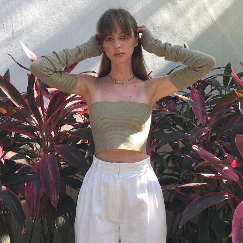 2022 Spring New Off Shoulder Green Knit Crop Tops for Women Tube Top With Sleeve Backless Tanks Cropped Feminino Top Streetwear