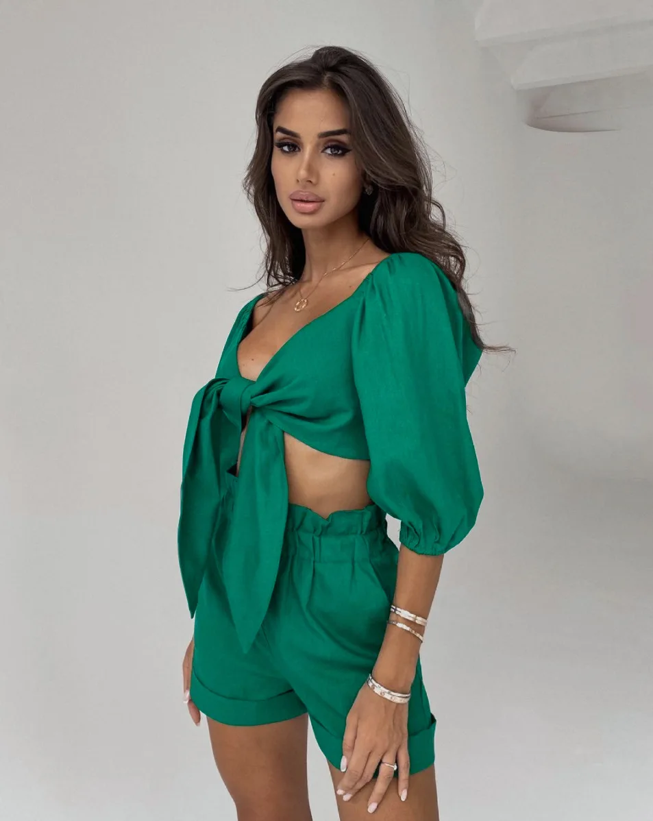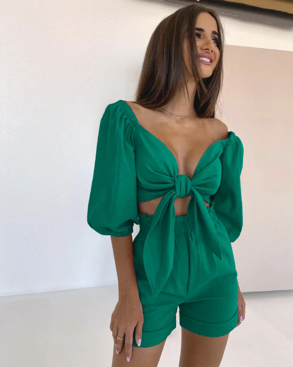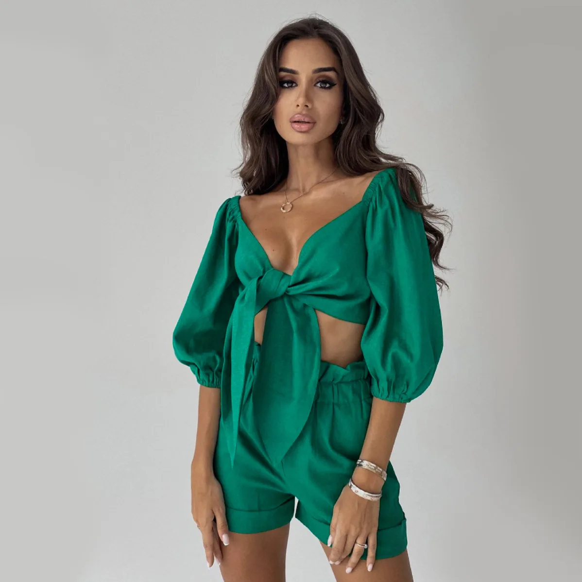 2022Spring and Summer New Product Pure Color Fashion Sexy Cotton Linen Cardigan Top Pocket Shorts Casual Suit Set Woman 2 Pieces