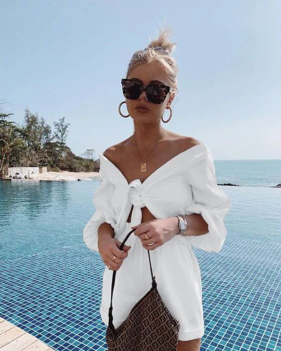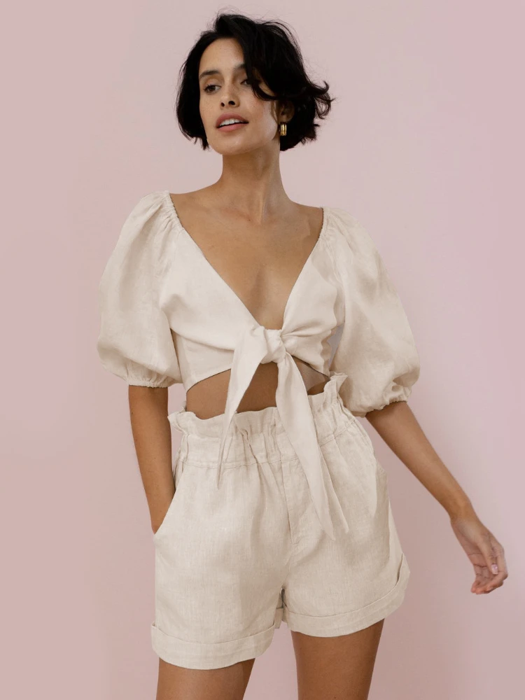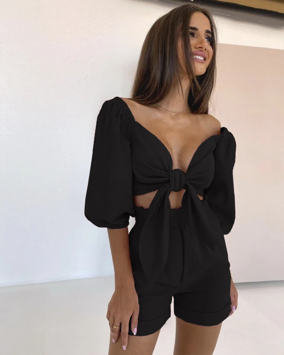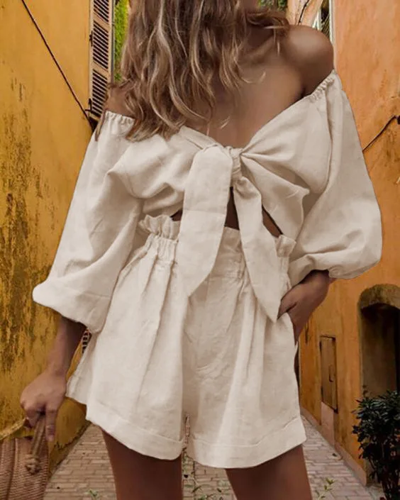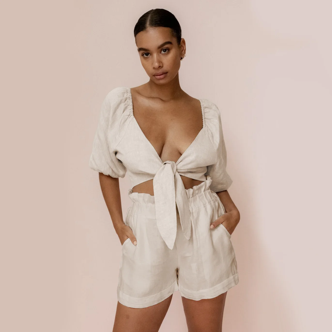2022Spring and Summer New Product Pure Color Fashion Sexy Cotton Linen Cardigan Top Pocket Shorts Casual Suit Set Woman 2 Pieces