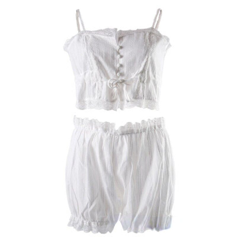 2Pcs Women's Court Style Pajamas Sexy Button Up with Shorts Lacy Trim Sleeveless Cotton Homewear Female Casual Underwear Set