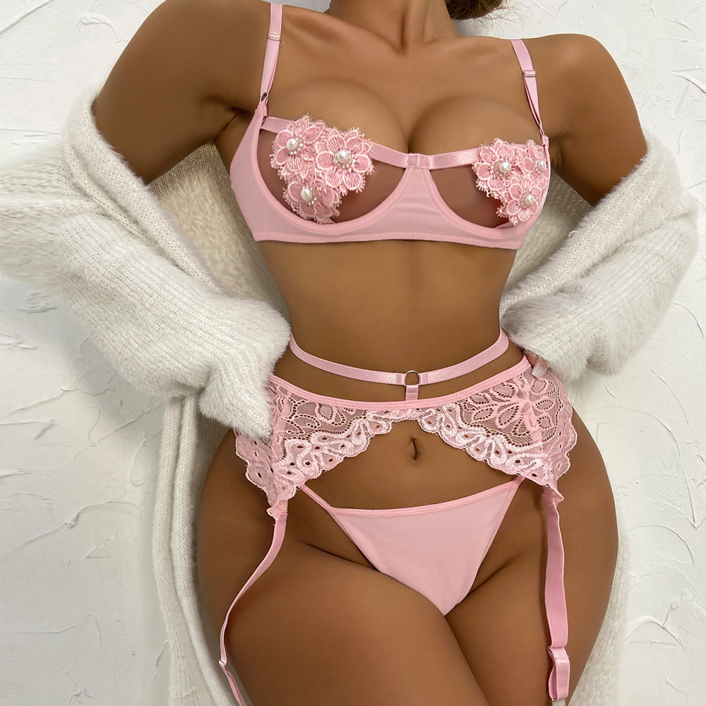 3 Piece Set Lace Pearl Erotic Lingerie Outfits Floral Embroidery Sexy Bra and Briefs Set Garters Mesh Sensual Lingerie Underwear