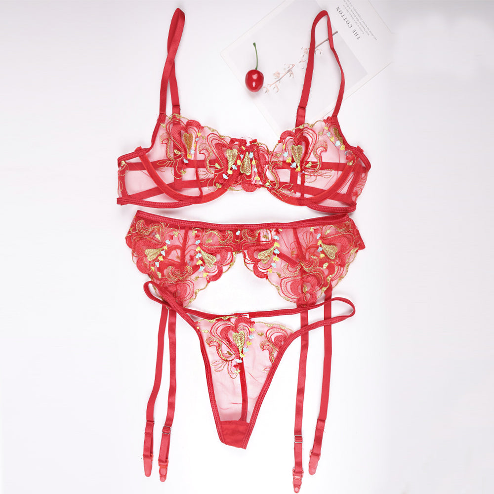 3 Pieces Set Embroider Sexy Sensual Lingerie Underwear Women Flower Erotic Costumes See-Through Bra and Thong Exotic Underwire