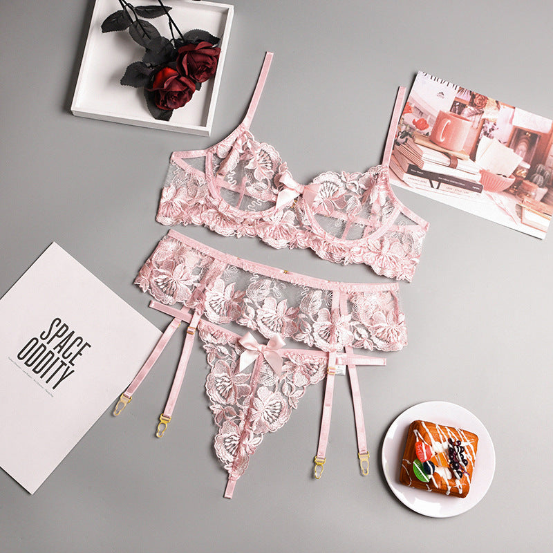 3 Pieces Set Sexy Floral Embroidery Underwear Perspective Erotic Costumes with Garters Sensual Exotic Women's Lingerie Bra Set