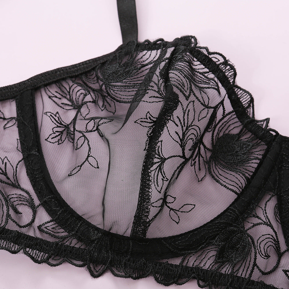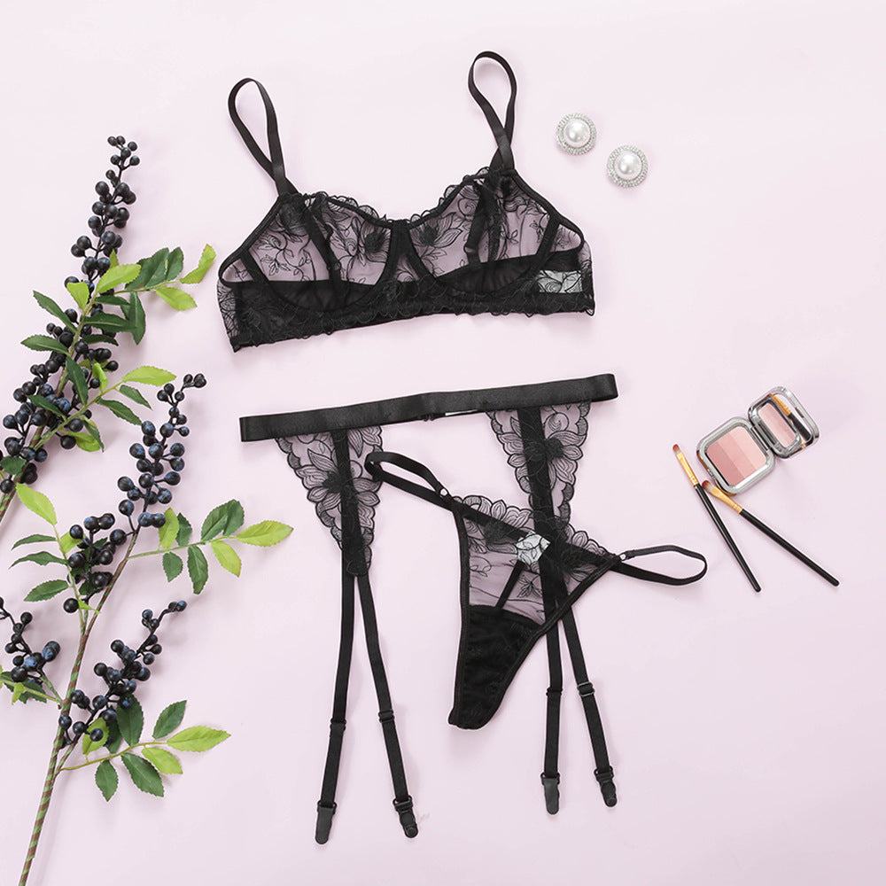3 Pieces Set Women Sexy Floral Embroidery Underwear Perspective Erotic Bra and Briefs Set with Garter Sensual Lingerie Sex Set