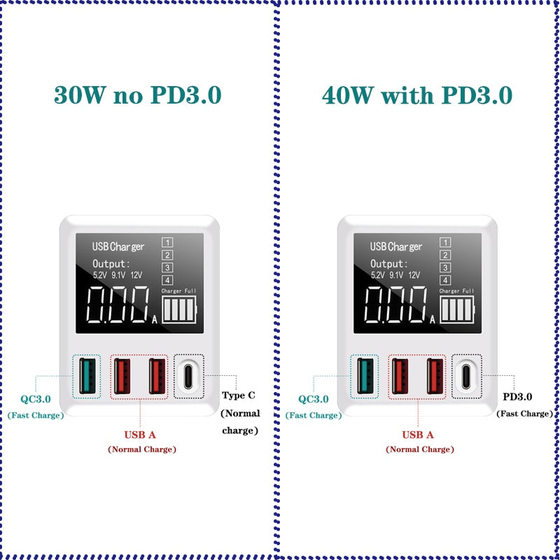 A: The Type C port (the fourth port) of "40W with PD3.0" version supports PD fast charging, but the "30W no PD3.0" version does not. (Other ports are the same.)