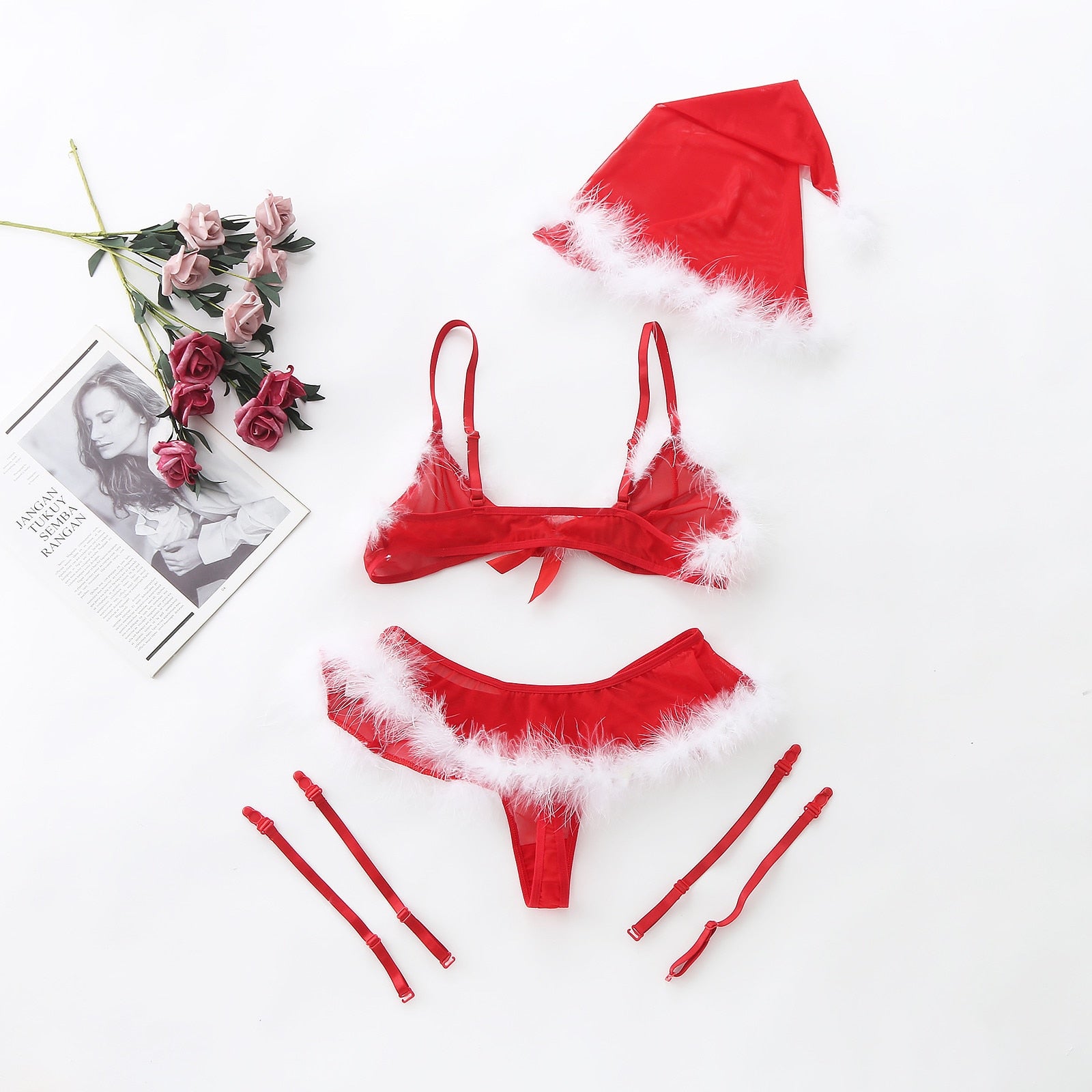 3PC Women Christmas Hat Lingerie Set Bowknot Sexy Underwear Transparent Lace Bra Thong Garters Set Exotic Babydoll Sexy Costumes
