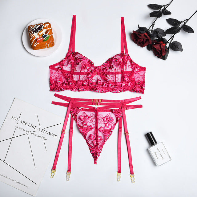 4 Pieces Women Sexy Floral Embroider Underwear See-Through Erotic Costumes Bra and Thong Sensual Lingerie Exotic Underwire Set