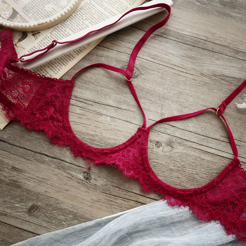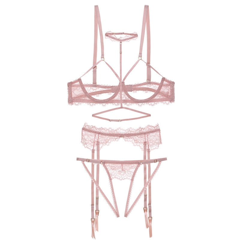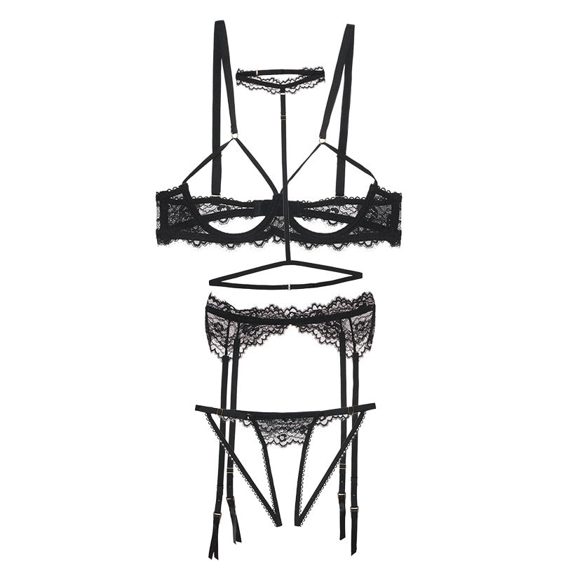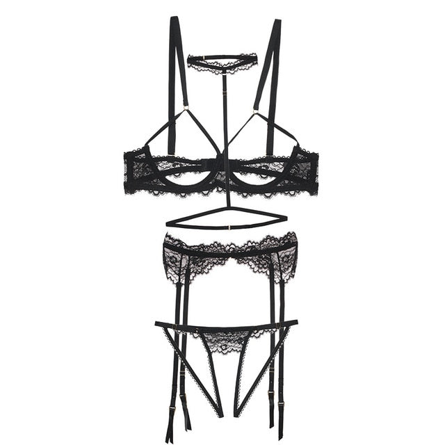 4pcs Bra Set Sexy Lace Open Bra Crotchless Panty Garter Halter Women Lingerie Set Exquisite Bra+Garter+Briefs Set Dropship