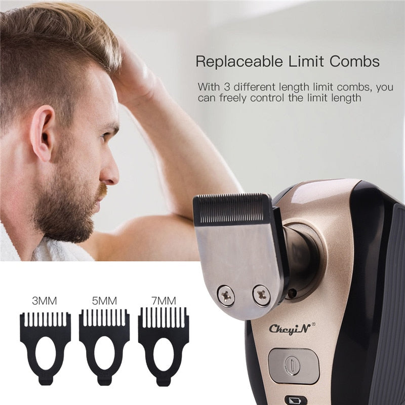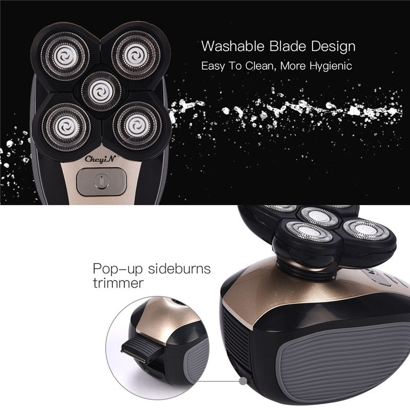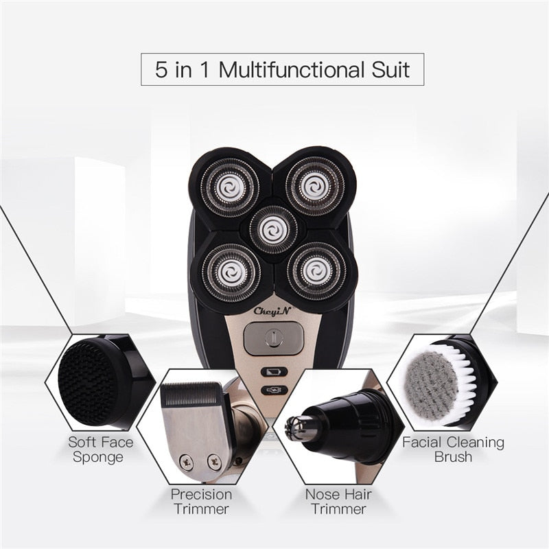 Feature: Five independently floating heads, intelligent shaving. It can shave your beard, your head, one machine dual purpose, economic and practical. IPX7 waterproof, the whole body is washable and can be cleaned with running water. Comes with a pop-up sideburns trimmer, can be used for trimming mustache and sideburns. 5 in 1 kit, besides the razor head, there are precision trimmer head, nose and ear trimmer head, soft face sponge and facial cleaning brush. The precision trimmer head: use together with three different limit combs(3mm, 5mm, 7mm) to trim, easier to create personalized hairstyle. The nose and ear trimmer head: can be used for removing your nose and ear hair. The facial cleansing brush: with very fine bristles, it removes oil and dirt on the skin, suitable for face exfoliating, cleansing. The soft face sponge: pre-shave massage to soften stubble for easier shaving. Rechargeable design, built-in 600mAh battery, after 5 hours full charge, it can be used continuously for 45 minutes. Note: The head shaving function is only suitable for those who often stay bald head, because the scalp of people who don't always stay bald head is relatively fragile, and suddenly shave may hurt the scalp. Specification: Material: ABS Battery: 600mA Charging time: 5 hours Using time: 45 minutes Waterproof level: IPX7 Size: 9*6*8cm(L*W*H) Color: Black + Golden Weight: 310g Package Content: 1 x Electric shaver(with protective cover) 1 x USB CABLE 1 x Nose and ear trimmer head(with protective cover) 1 x Precision trimmer head 1 x Soft sponge brush 1 x Facial cleaning brush(with protective cover) 3 x Limit comb(3,5,7mm) 1 x Cleaning brush 1 x User manual(English/Chinese) 1 x cloth pack in box