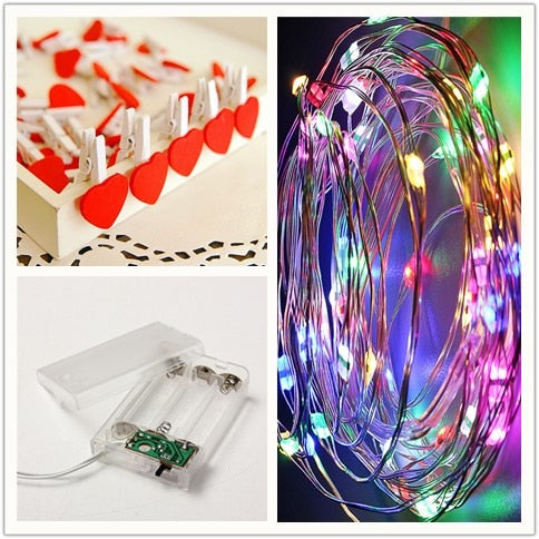 *Copper light string 5M 50LEDs, battery box (without battery), 20pcs wooden clips. *Copper light string 10M 100LED, battery box (without battery), 40pcs wooden clips. *Power: 3*AA dry battery or USB * Copper wire color: sliver or copper color. * Space between two LEDs: 10cm. * Lighting color: White, Warm White, Yellow, RGB * Clip size: Heart clip:2.5cm length. * Clip size: Normal wooden clip: 3.5cm on length.