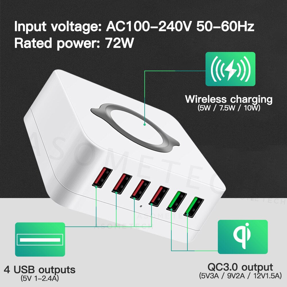 72W 6 Port Quick Charge 3.0 USB Charger Adapter Wireless Charger Charging Station Phone Charger For iPhone Samsung Huawei Xiaomi