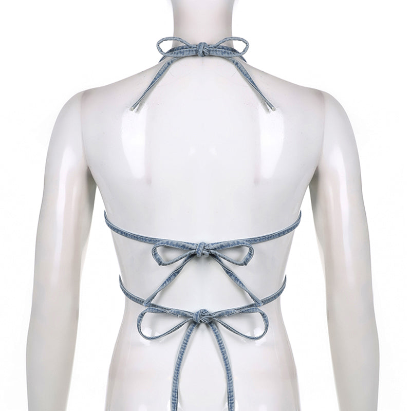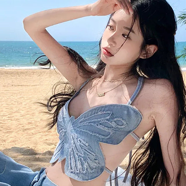 Sexy y2k Butterfly Jeans Crop Top Backless Strap Camis Blue Cute Party Sweats Women Beach Holiday Mini Vest Tee Summer 2022