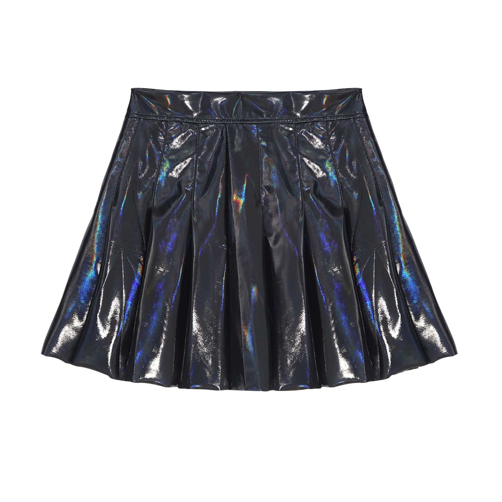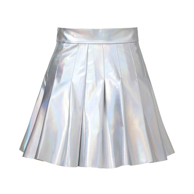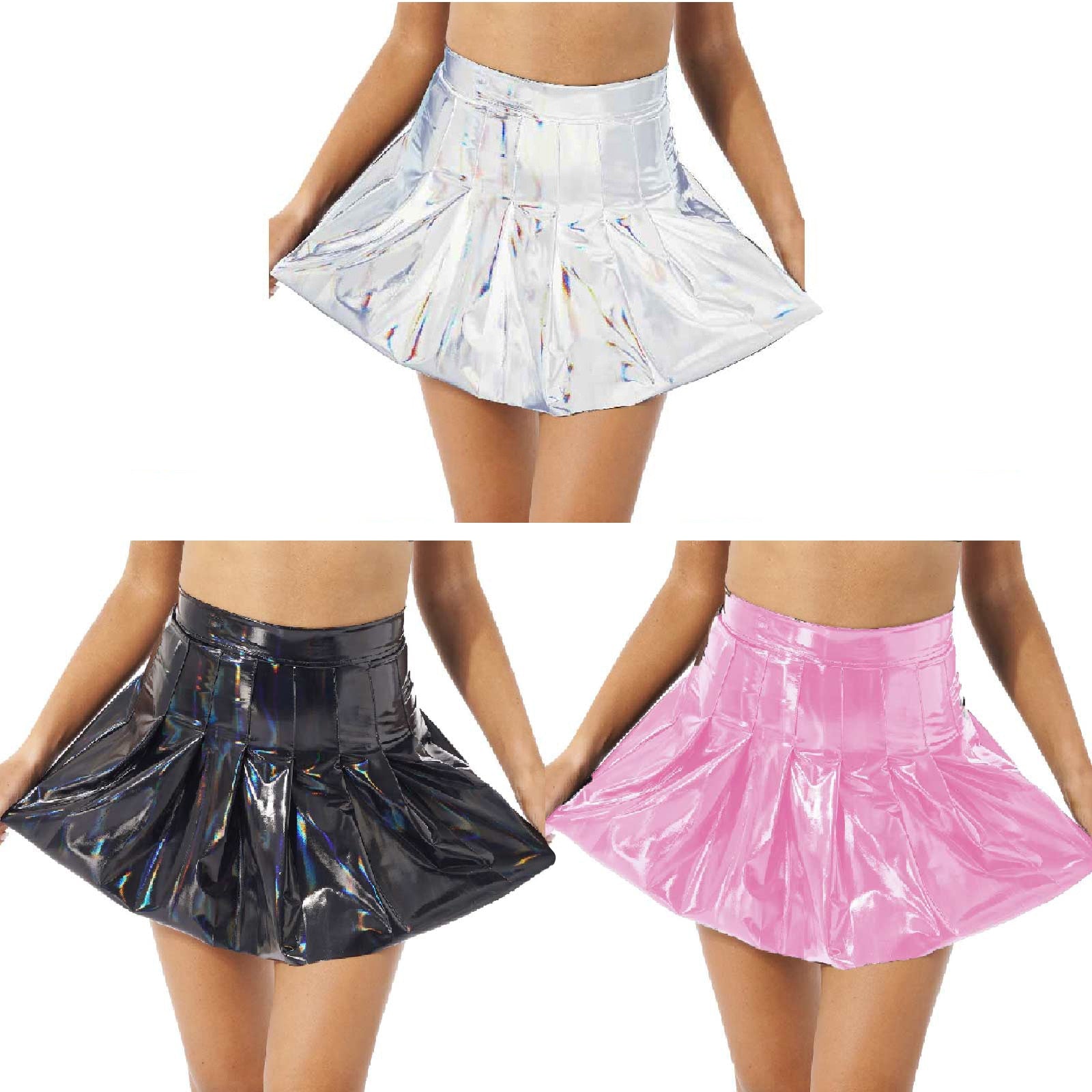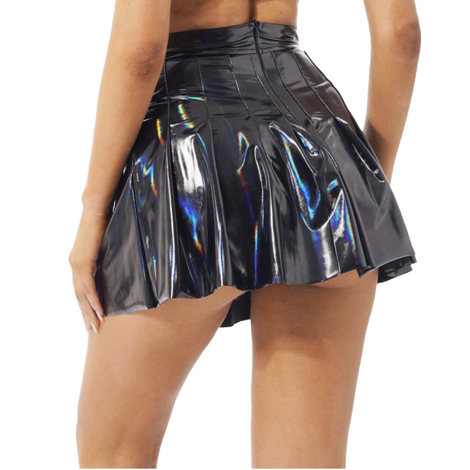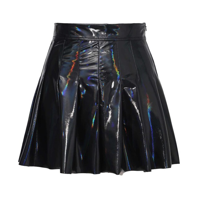 Summer Sexy Shiny Glossy High Waist Mini PU Leather Skirt Bottoms Club Party Dance Shiny Holographic Metallic Pleated Skirts